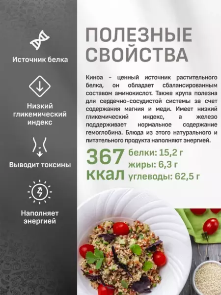 - Ценный источник растительного белка, киноа содержит его больше, чем многие виды мяса. При этом, белок киноа обладает сбалансированным составом аминокислот, похожим на состав белка молочных продуктов.