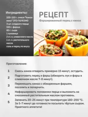 Замените рис на микс киноа в рецепте фаршированного перца. Вегетарианский вариант: смешайте предварительно промытую и сваренную киноа, обжаренные с репчатым луком и морковью грибы, и зелень. Фаршируйте перец начинкой и тушите его в подливе из томатной пасты и специй или запеките в духовке. Перед подачей посыпьте свежей зеленью.