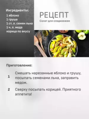 Смешайте 250мл свежевыжатого морковного сока и 1 столовую ложку размолотых в кофемолке льняных семян. Ваш коктейль красоты готов! - Салат для сладкоежек
