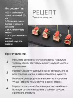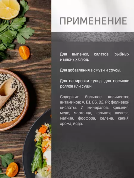 • Используйте смесь для выпечки, рецептов азиатской кухни, салатов, рыбных и мясных блюд. Попробуйте использовать сместь для панировки тунца или для посыпки ролов или суши.