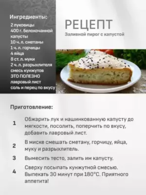 • Заливной пирог с капустой. Обжарить до золотистого цвета 2 нарезанные кубиками луковицы. Добавить 400г нашинкованной белокочанной капусты. Готовить до мягкости, посолить, поперчить по вкусу, добавить лавровый лист. В миске смешать 10ч.л. сметаны, 1ч.л. горчицы, 4 яйца, 8ст.л. муки, 2ч.л. разрыхлителя. Вымесить тесто, залить им капусту. Сверху посыпать кунжутной смесью. Выпекать 30 мин при т180 градусов.