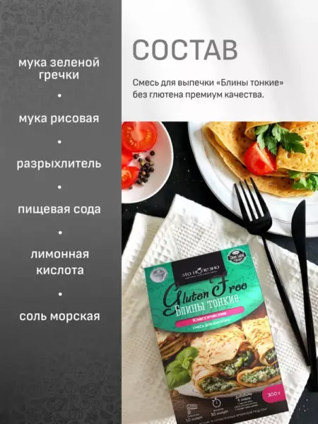 Состав:Мука из зеленой гречки, мука рисовая, крахмал тапиоки, разрыхлитель (пищевая сода, лимонная кислота), соль морская.