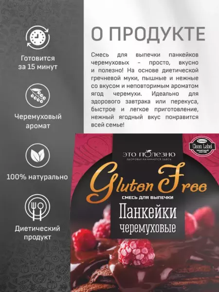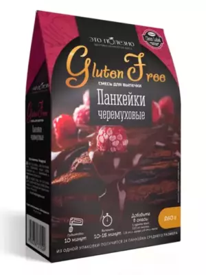 Состав:Мука черемухи, мука рисовая, мука миндальная, разрыхлитель (пищевая сода, лимонная кислота).