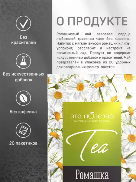 Polezzno представляет вам коллекцию ромашковых чаев, в составе которой 2 компонента, 2 ноты. Первая – ромашка, дополняется и приобретает необычное звучание за счет второй – изысканной лаванды, мужественного чабреца, медовой липы, экзотического ройбуша и уютной мелиссы. Два вкуса и аромата позволят вам насладиться гармоничным и ярким букетом, не заглушая вкус ромашкового чая, но делая его более интересным и запоминающимся.
