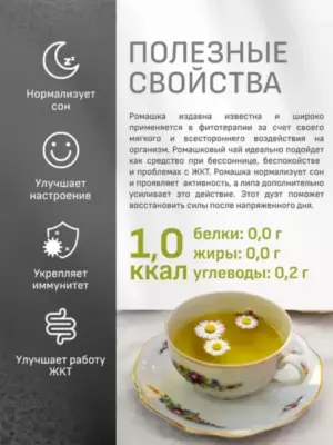 Ромашка издавна известна и широко применяется в фитотерапии за счет своего мягкого и всестороннего воздействия на организм. Мягким вкусом и легким летним ароматом ромашковый чай завоевал популярность среди любителей травяных напитков без содержания кофеина. Теплый чай с ромашкой успокоит, расслабит и настроит на позитивный лад.