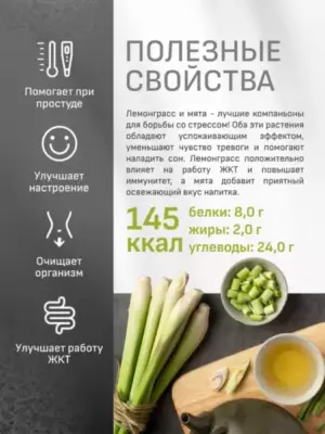 - Лемонграсс положительно влияет на желудочно-кишечный тракт, повышает иммунитет, способствует мозговой деятельности.