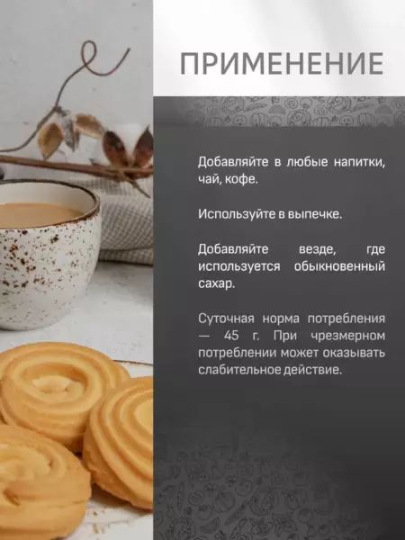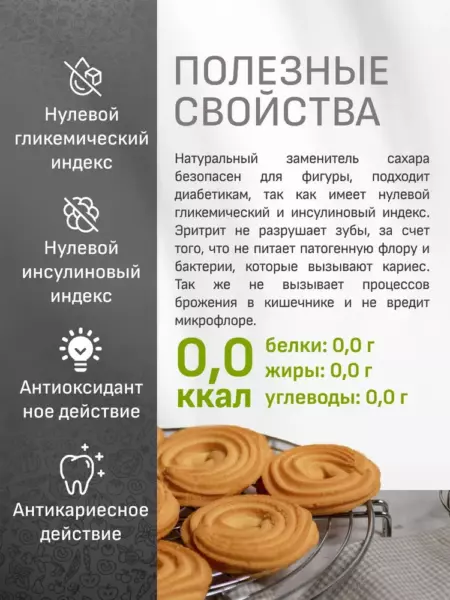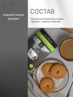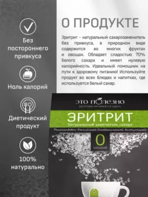Каждый, кто задумывается о своем здоровье, стремится сократить потребление сахара. В ваших руках инновационный, не имеющий аналогов натуральный продукт, который позволит вам наслаждаться сладкими напитками и выпечкой без вреда для здоровья и фигуры! Эритрит находится в естественном виде во многих овощах и фруктах, вырабатывается в промышленных масштабах он из тапиоки или кукурузы. Доказана полная безвредность эритритола для организма.
