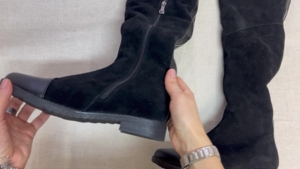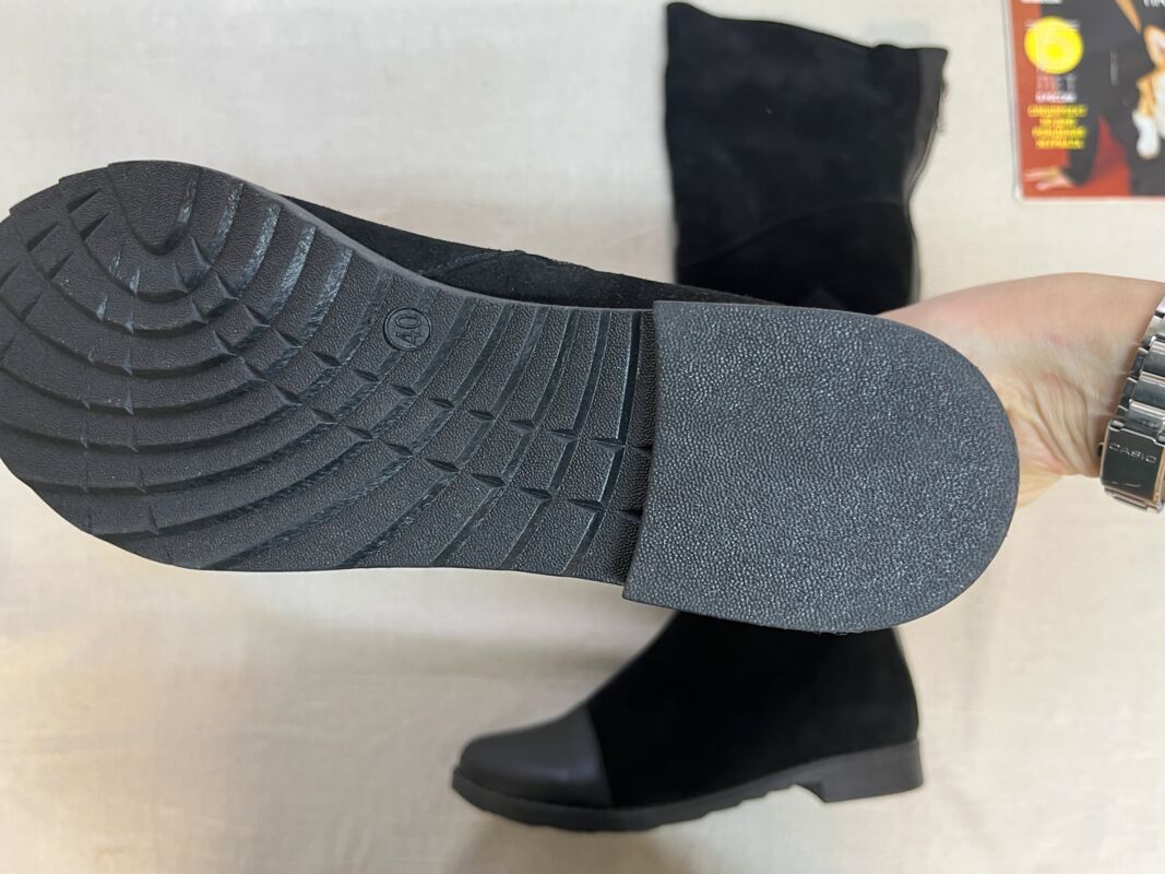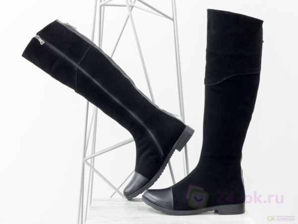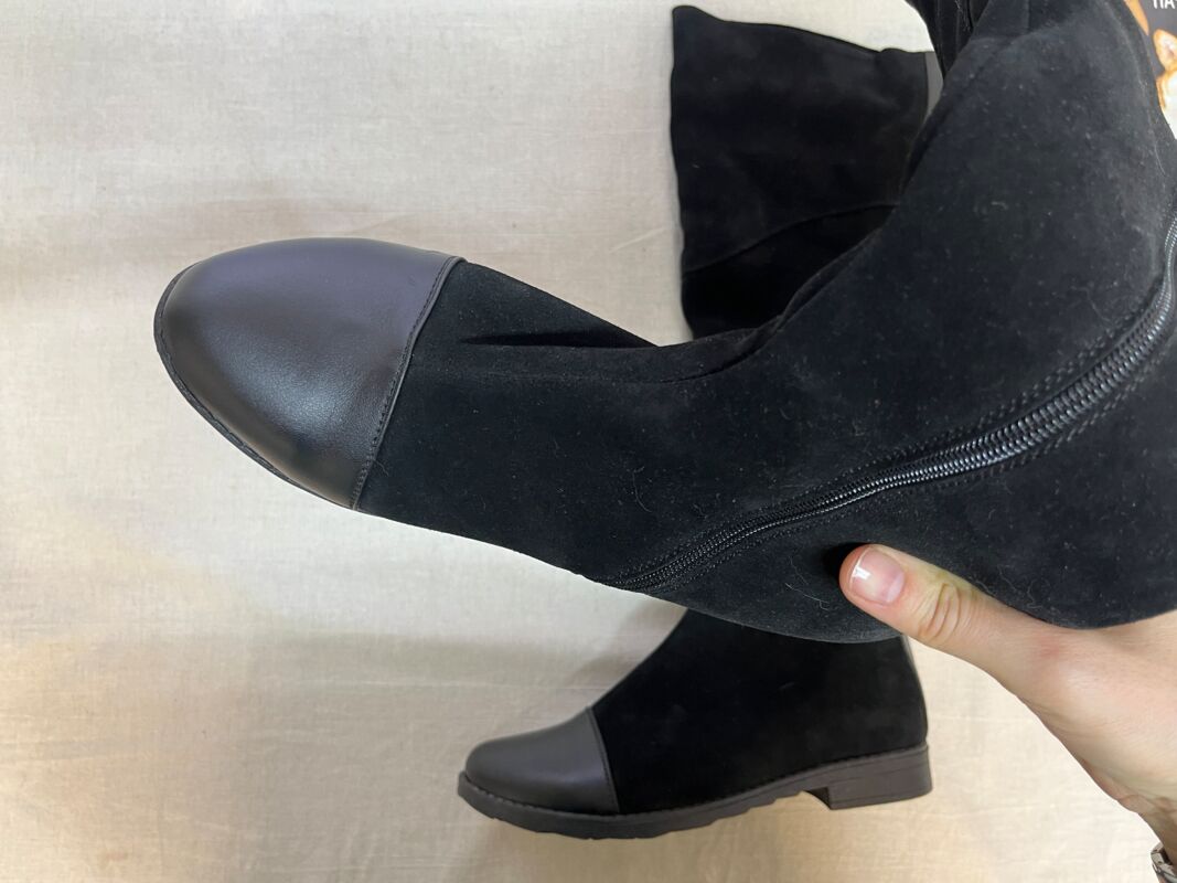 Высокие женские сапоги из натуральной замши и кожи черного цвета на невысоком каблуке, с молнией по всей длине, М-111-25. Без орг процента и доставки!!!