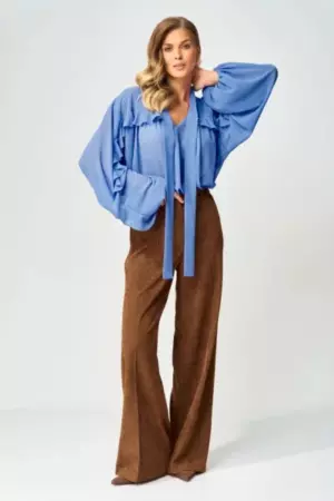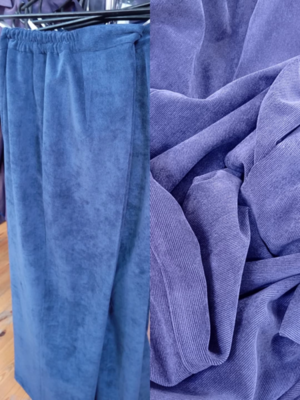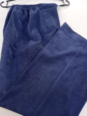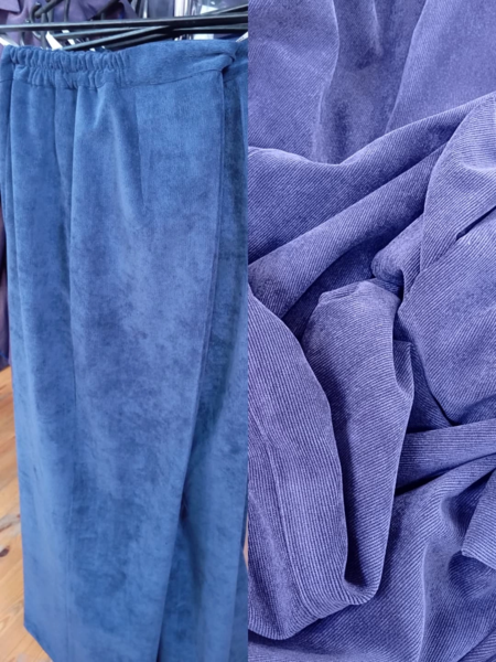 Брюки палаццо с притачным поясом из мягкой вельветовой ткани. Спереди застежка гульфик на молнии и петлей и пуговицей по поясу. По задней частям брюк вытачки. Пояс с резинкой в боковых частях. Брюки с заутюженными стрелками. Длина брюк с учетом пояса - 109 см.