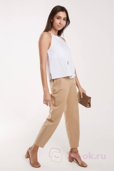 Универсальные брюки слоучи (т.е. мешковатые - подвид мом джинсов) - один из трендов 2022 года. Брюки на резинке на талии, без молнии, что очень комфортно при долгой сидячей работе. По поясу 5 шлёвок для ремня. Брюки из плотной хлопковой ткани по плетению похожей на джинс, но тоньше. Брюки со средней посадкой талии, свободного кроя, зауженные внизу, с двумя карманами с отрезными бочками по переду. Задние половинки брюк с фигурной кокеткой и накладным карманом на правой половинке. Брюки украшены хольнитенами, отделочными строчками и логотипом бренда. Низ брюк обработан застрочным швом с закрытым срезом, что дает красивый край при подвороте. По низу две вытачки. Длина брюк по боковому шву 95 см.