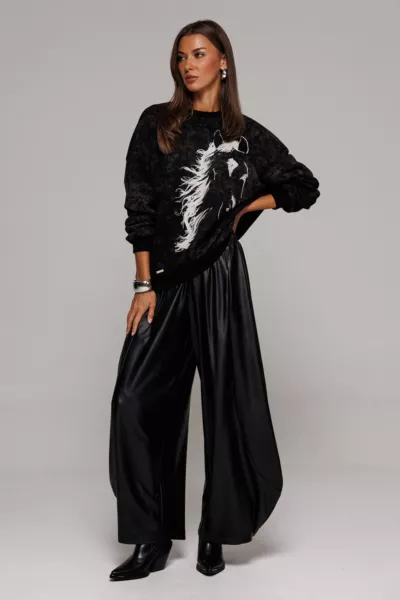 Джемпер из трикотажного полотна свободного силуэта, слегка заужен к низу, с втачным рукавом и спущенной линией плеча, с манжетой из отделочной ткани по низу рукава. По переду печать "HORSE" и нашивка с гравировкой "BUTER", низ фигурный. Спинка длиннее переда. По горловине и низу изделия притачная планка из довяза.