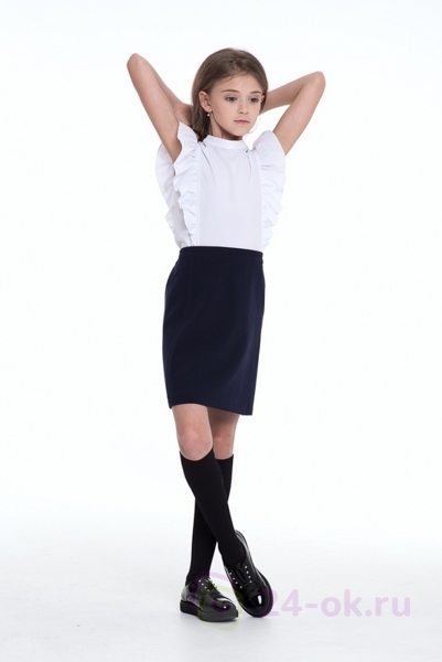 Блуза для девочек младшей и старшей школьной возрастной группы, полуприлегающего силуэта. Бочки переда и спинки выполнены из трикотажа, центральные детали, а также воланы и стойка из отделочной ткани – ниагара. Перед и спинка с оборками-крылышками. Спинка со средним швом. Воротник – стойка, застегивающаяся сзади на две навесные петли и пуговицы. Используются нитки в тон с основным материалом. Состав ткани: 95% хлопок, 5% эластан. Изделие может быть использовано для повседневной носки.