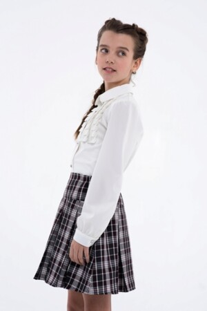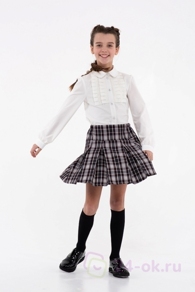 Блуза – для девочек младшей и старшей школьной возрастной группы из трикотажа, прямого силуэта. Перед – с центральной застежкой на 6 обметанных петель и пуговиц. На полочках настрочено по 2 ряда складок с кружевом.
