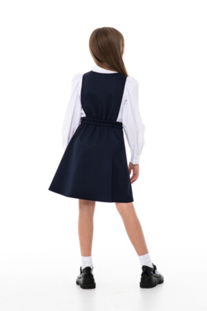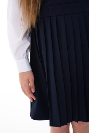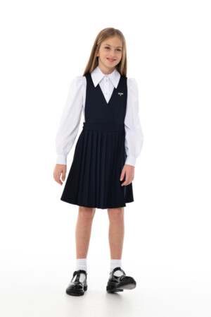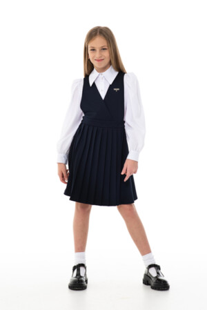 Синий сарафан для девочки - это основа её базового школьного гардероба при создании аккуратных и стильных академических образов! Модель можно дополнить контрастным или в тон по цвету галстуком с классической рубашкой или надеть с более романтичной блузкой с оборками и кружевом.