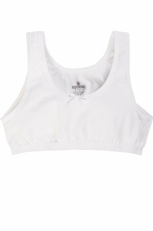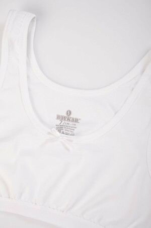 Бельевой топ сшит из трикотажного хлопка, который подойдет даже для самых чувствительных детей. Все швы подросткового бюстгальтера гладкие и не будут беспокоить ребенка во время активных занятий, в проймах мягкие эластичные бейки. Благодаря небольшому добавлению эластана топик хорошо тянется, отлично сидит по фигуре. Белый бюстик сохранит первоначальные свойства даже после многочисленных стирок.