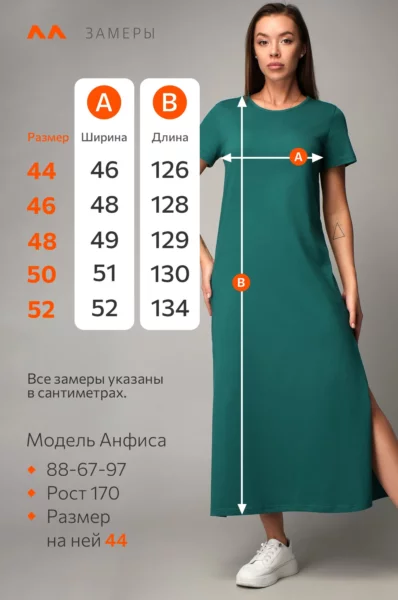 Модель Анфиса, ее рост 170 см, параметры 88-67-97 см. На ней размер 44.