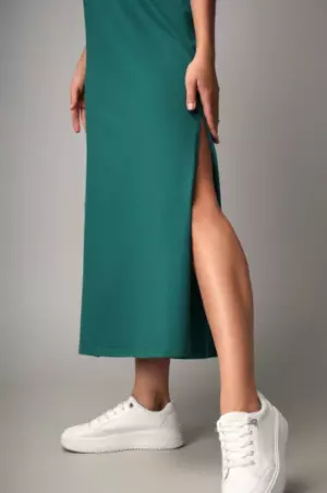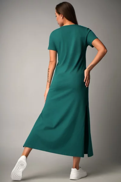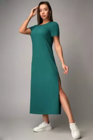 Однотонное зеленое платье – универсальная база на каждый день. Благодаря длине миди и удобным разрезам летнее платье дарит свободу движений. Изумрудное платье станет стильным акцентом. Трикотажное платье подходит для прогулок летом.