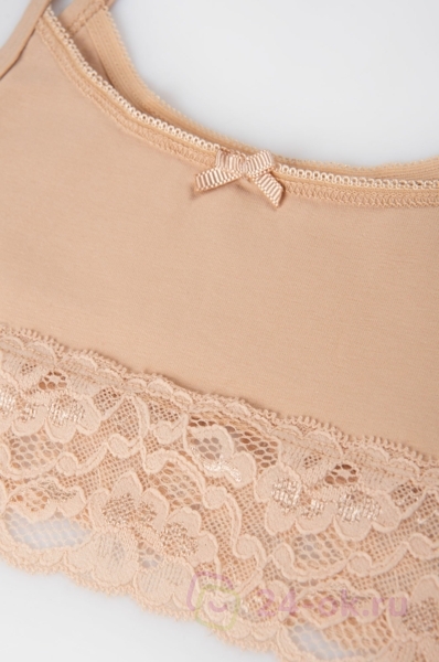 Лифчик для девочки и трусы слипы украшены атласными бантиками. Майка-топ на тонких бретелях не стесняет движений, а хлопковые трусики-слипы с мягкой резинкой приятно прилегают к телу.