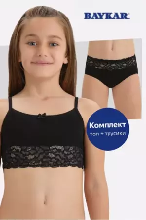 Нежный однотонный комплект белья для девочки и девочки подростка выполнен из натурального хлопка с эластаном. Бельевой комплект бежевого цвета комфортно носить под любую одежду круглый год. В наборе майка топ для девочек и трусы в черном цвете. Комплект украшен эластичным и кружевом.