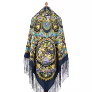 Многоцветный платок из уплотненной шерстяной ткани с шелковой бахромой "Душа розы", вид 12, 148х148см