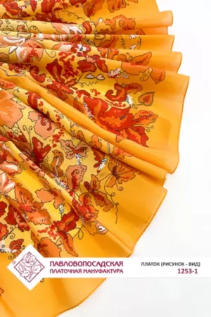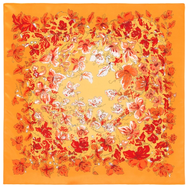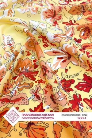 Кайма платка персиковая. Рисунок выполнен в золотистых и красных тонах. В завитках цветочных усиков можно прочитать слово LAMOUR.