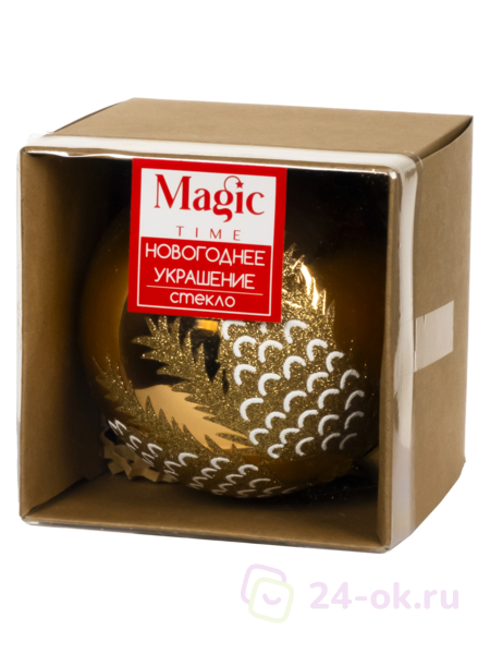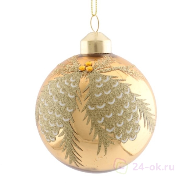 Стеклянный шар - настоящее произведение декоративного искусства и дополнение новогодней елки. Это классический вариант новогоднего подвесного украшения. Шар выполнен из тонкого стекла. Стеклянная новогодняя елочная игрушка диаметром 8 см идеально подходит для елок среднего и большого размера. На небольших новогодних деревьях шар может также гармонично смотреться, но лучше размещать его на нижних или средних ветках. Шар декорирован рисунком шишки.