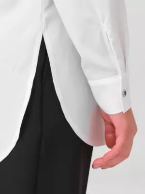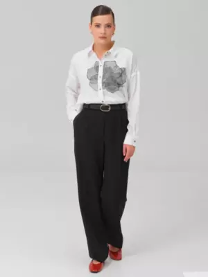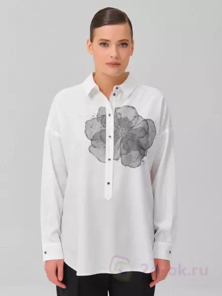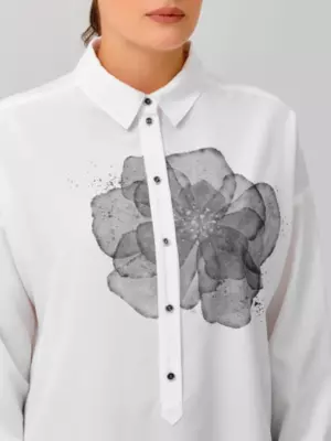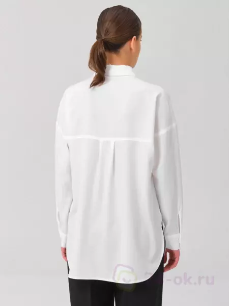 Модель прямого силуэта, со спущеным плечом. Спереди планка с застёжкой на петли и пуговицы. Спинка с кокеткой, под кокеткой скдадка. Воротник сорочечный. По низу рукава разрез, защип и манжета с застёжкой на пуговицу. В боковых швах разрезы. Низ блузки разноуровневый, длиннее по спинке, закруглён.