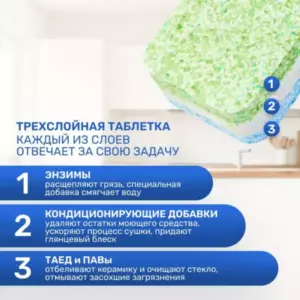 Достаточно поместить одну таблетку в дозатор посудомоечной машины и посуда приобретает идеальную чистоту и свежесть, без разводов и известковых пятен. При использовании на коротких циклах мойки рекомендуется положить таблетку на дно посудомоечной машины.