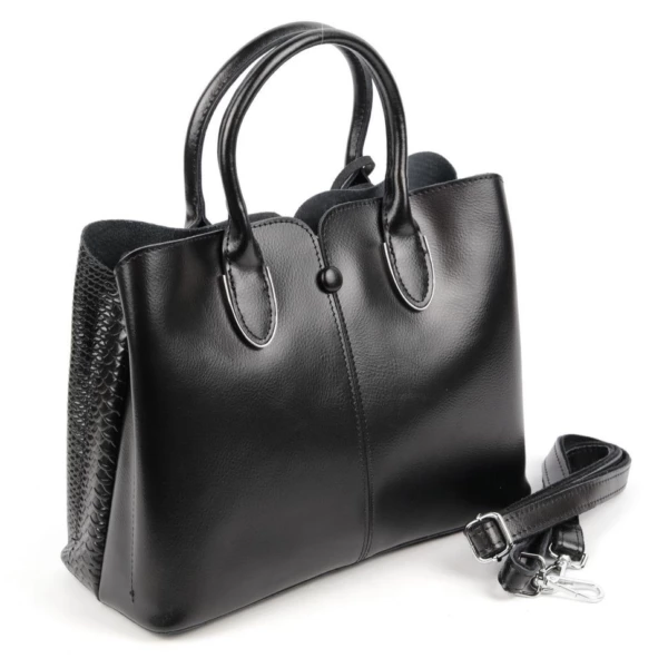 Женская сумка из натуральной гладкой кожи и кожи под змею черного цвета.