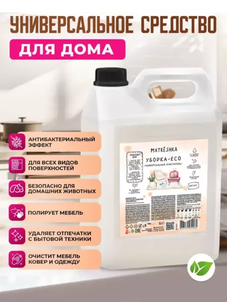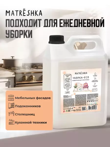 Универсальное пенное моющее средство от Матрешка на основе экологичных органических растворителей. Эффективно справляется с бытовыми загрязнениями, такими как жир, отпечатки пальцев, пыль. Подходит для очищения водостойких поверхностей: пластик, дерево, паркет, ламинат, нержавеющая сталь, керамика, плитка, стекло, гранит и т. д., а также изделий из ткани и кожи, в том числе обуви, обивки мягкой мебели, ковровых покрытий. Не оставляет разводов. Сохраняет структуру поверхности (ткани) и цвет. Благодаря специальным компонентам в составе обладает антибактериальным эффектом. Устраняет неприятные запахи, подходит для ежедневной уборки.