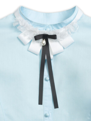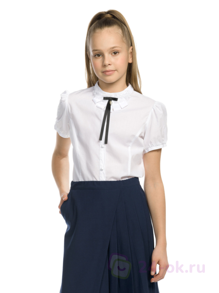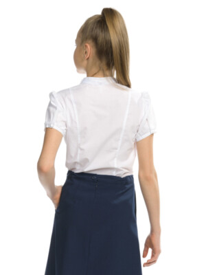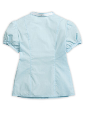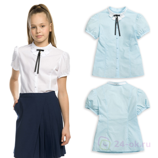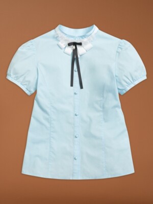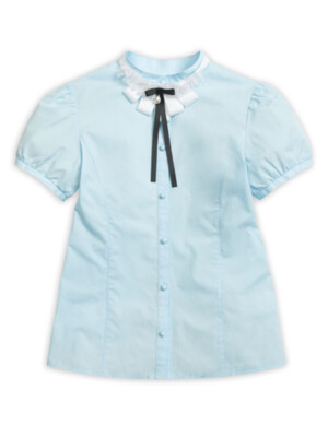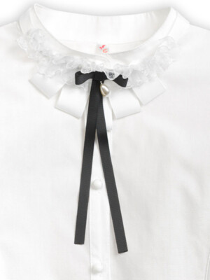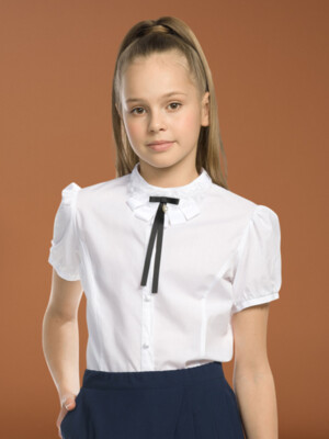 Состав: 60%хлопок 40%полиэстер Базовая рубашкаа со съемным декоративным элементом. Рукава-фонарики отлично подойдут для теплой погоды, а легкий дышащий материал позволит вести активную школьную жизнь, сохраняя комфортную температуру тела. Воротник имеет вшитые шлевки, которые держат украшение из репсовых лент, кружева и маленького черного бантика. Конструкция не утяжеляет и не оттягивает ворот изделия, а держится сзади на небольшой кнопке. Сдержанная каплевидная жемчужина завершает аристократичный образ современной леди.