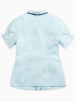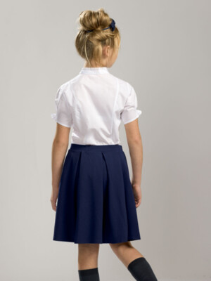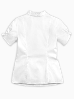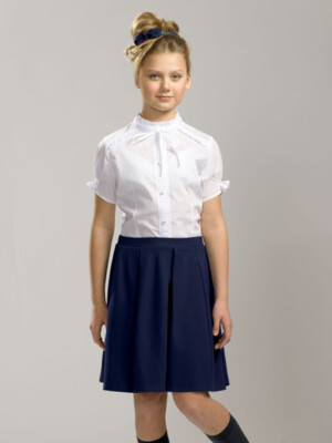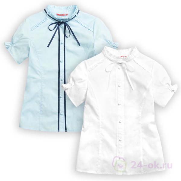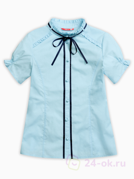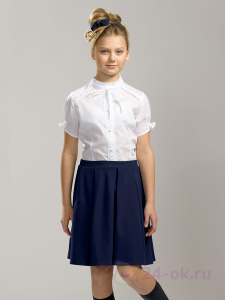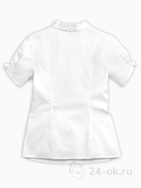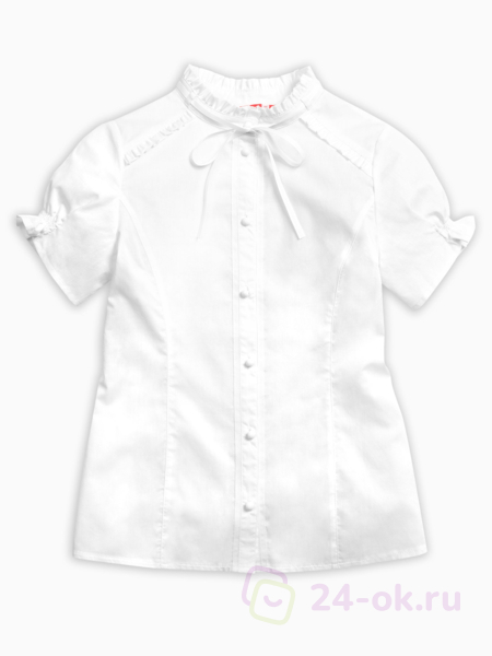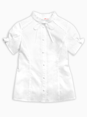 Состав: 60%хлопок 40%полиэстер Классическая блузка с коротким рукавом. Аккуратные узкие рюши украшают воротник-стойку, верхние края манжет рукавов и шов притачивания кокетки переда. Узкая репсовая лента вдоль планки по переду и по воротнику придает особую изысканность модели. Новый короткий рукав: его низ собран на шпульную резину, которая современно и по-новому формирует рукав типа «фонарик».