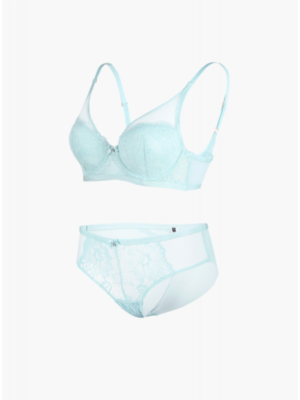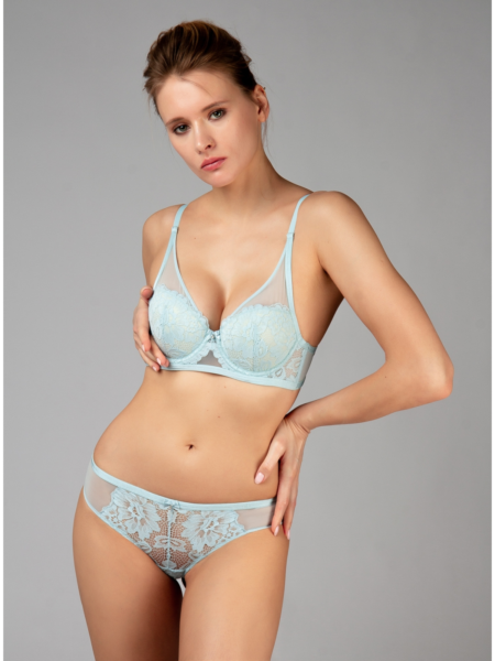 Комплект нижнего белья от торговой марки Индефини. В комплекте бюстгальтер и трусики. Бюстгальтер голубого цвета, на косточках, без Push-up, с формованной чашкой, с кружевным обрамлением и вставками, со вставками из микросетки, с косточками по бокам, лямки регулируются. Трусы-слипы голубого цвета, из кружевной ткани, на мягкой резинке. К бюстгальтеру идут трусики, размерами: 75B-S, 75C-M, 80B-M, 80C-L, 85B-XL. Состав: 90% полиамид 10% эластан_x000D_ _x000D_ Производитель: Indefini