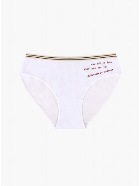 Женские трусы от торговой марки Индефини. Трусы-слипы из хлопка, белого цвета, с принтом-надписями, средней посадки, на мягкой резинке. Состав: 95% хлопок 5% эластан_x000D_ _x000D_ Производитель: Indefini