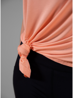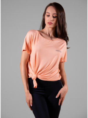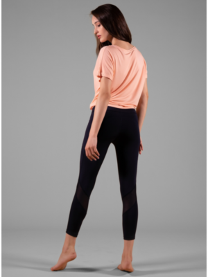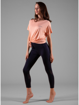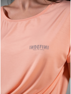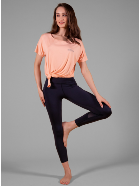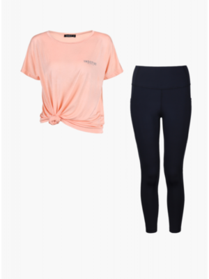 Костюм для спорта от торговой марки Индефини. В комплекте футболка с леггинсами. Футболка из бамбука, лососевого цвета, с принтом, с короткими рукавами, укороченная, с декоративной сборкой спереди, свободного кроя. Леггинсы черного цвета, со вставками из микросетки, средней посадки. Состав: футболка – 95% бамбук 5% эластан; брюки – 85% полиэстер 15% эластан_x000D_ _x000D_ Производитель: Indefini