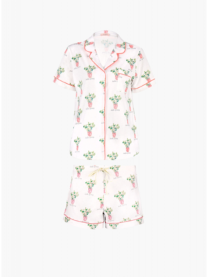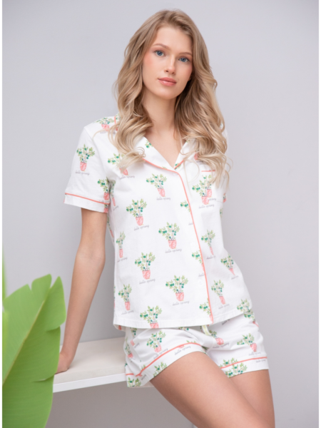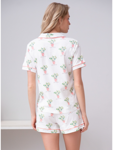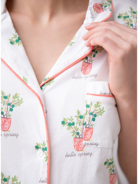 Женская пижама из трикотажного хлопка обладает мягким дышащим материалом, который обеспечивает комфортный сон. Футболка имеет отложной воротник и нагрудный кармашек, украшенные розовыми вставками. В комплекте также идут шорты на мягкой резинке с регулирующимся поясом. Состав: 100% Хлопок._x000D_ _x000D_ Производитель: Indefini Материал: Хлопок