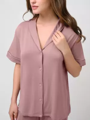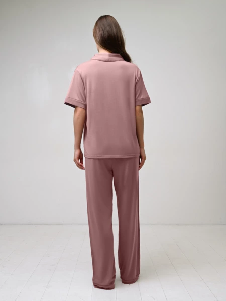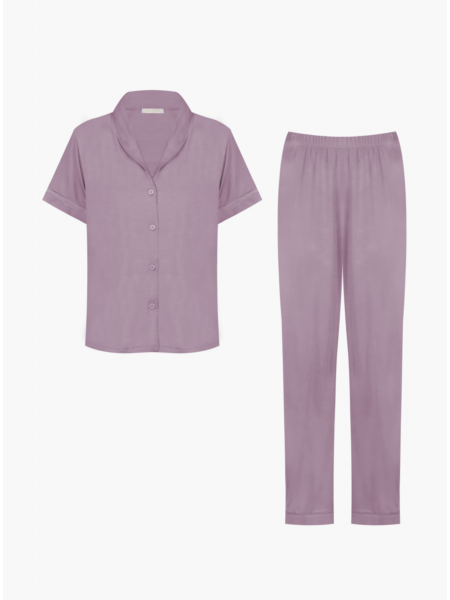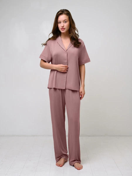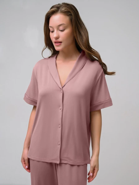 Женская пижама из модала приятная и мягкая на ощупь. Футболка свободного кроя позволяет свободно передвигаться и чувствовать комфорт. Она имеет короткие рукава, отложной воротник и застёгивающиеся пуговицы. Штаны на мягкой эластичной резинке плотно сидят на талии, не сползая во время носки. Состав: 95% Модал, 5% Эластан._x000D_ _x000D_ Производитель: Indefini Материал: Модал