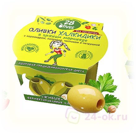 Оливки Халкидики без косточки в пряном маринаде с кориандром, паприкой, чесноком и петрушкой пл.конт