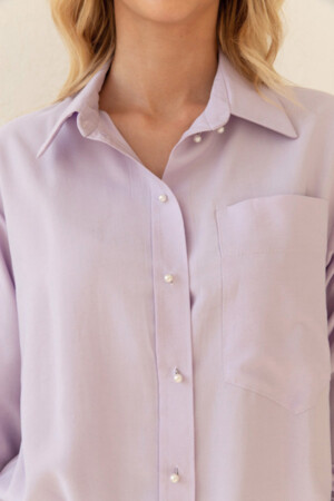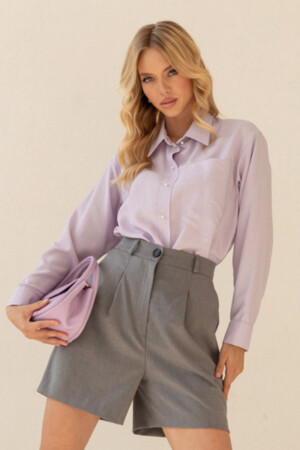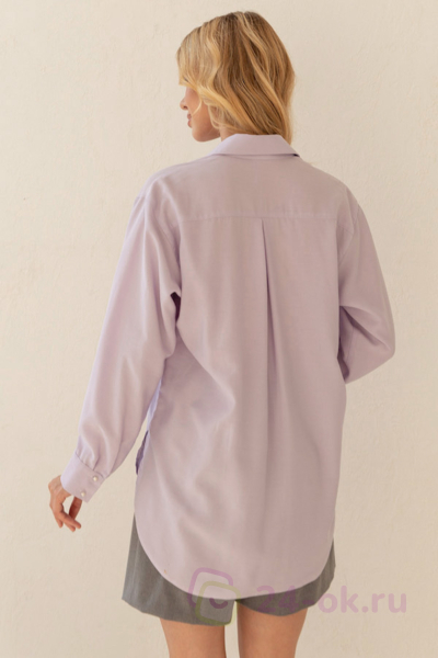 Рубашка из вискозной ткани свободного силуэта с застёжкой на планке. Низ изделия асимметричной длины (спинка удлинена относительно переда) с закруглениями по бокам. Вырез горловины обработан отложным воротником на стойке. Рубашечный рукав на манжете с застёжкой на пуговицы. На задней части изделия выполнена кокетка с небольшой складкой. На передней-накладной карман в области груди. Достоинство этой модели - в способности скрыть некоторые недостатки фигуры. Её можно сочетать как с брюками, так и с джинсами.