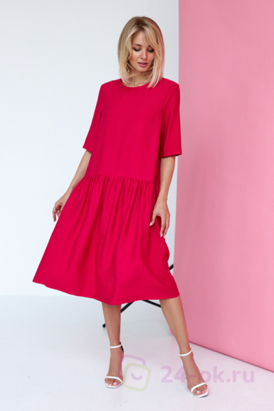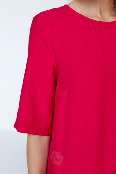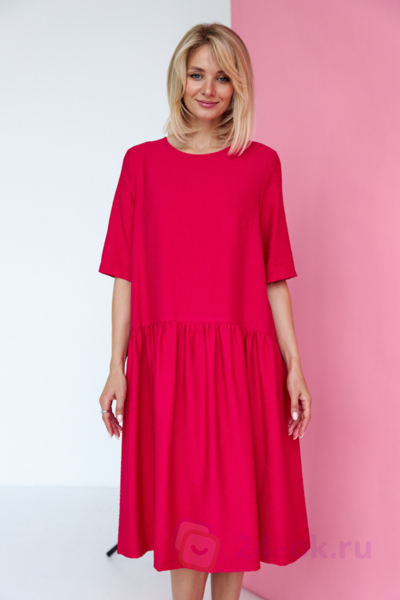 Платье свободного силуэта из вискозной ткани с крэш-эффектом. Изделие отрезное по линии бедра спереди и чуть ниже бедра на задней части. Верхняя часть юбки со сборкой. Втачной короткий рукав. Круглый вырез горловины оформлен косой бейкой из основной ткани. Сзади по среднему шву застежка-пуговица. В таблице размеров представлены параметры человека, а не изделия.