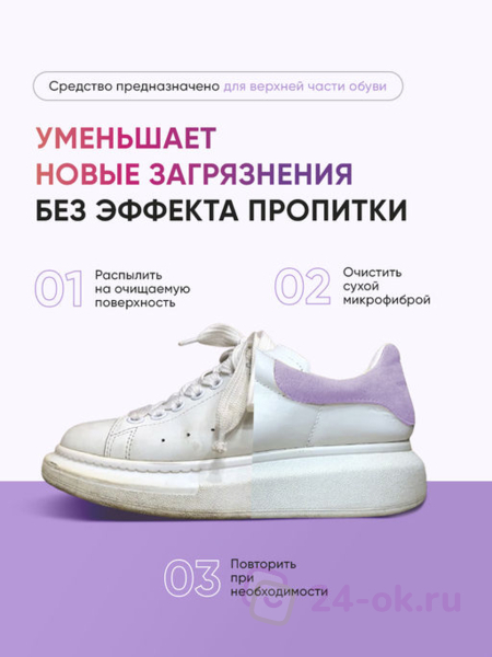 Легкая и сверхэффективная очистка обуви от различных бытовых загрязнений. За 1-2 минуты без применения воды она бережно и деликатно очищает обувь и придает защитные свойства. Обновляет цвет и текстуру материала. Теперь не нужно покупать множество разных средств для очистки каждого вида материала обуви! Nano-Чистка подходит абсолютно для всех материалов: все виды кожи, замша, нубук, велюр, текстиль, резина и др.. Применять для очистки легких и средних загрязнений: пыль, грязь, налет, следы слякоти, остатки пищи и т.п. Преимущества: 1. Экономит время: очистка 1 пары обуви за 1-2 мин; 2. Время высыхания: моментально; 3. Расход: 1 флакона хватит до 55 раз; 4. Приятный запах и не пачкает руки; 5. Экологически чистое и биоразлагаемое; 6. Всесезонное применение. Инструкция: 1. Распылить 2. Протереть сухой тряпочкой 3. Повторить при необходимости. *-неприменять, в случаях, когда требуется глубокая химическая очистка, стирка, реставрация, покраска и т.п.