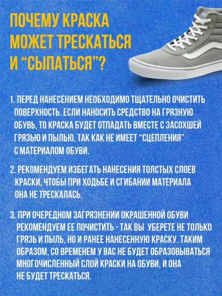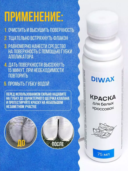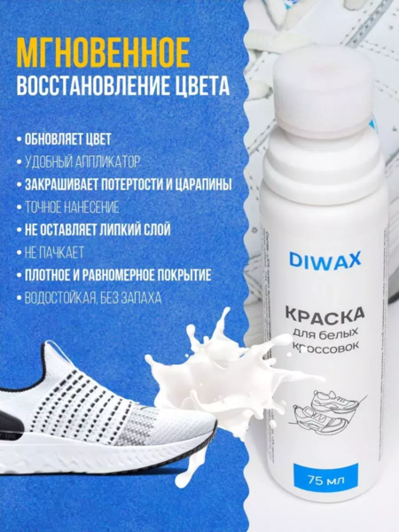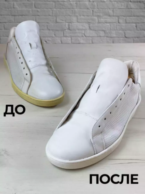 Краска для придания белоснежного цвета Вашей обуви: восстанавливает цвет белой обуви за 5 минут. Подходит для белой подошвы, для белых кроссовок, для обуви из белой кожи, для обуви из текстиля. Продукт превосходно закрашивает потертости и обновляет цвет белой подошвы.