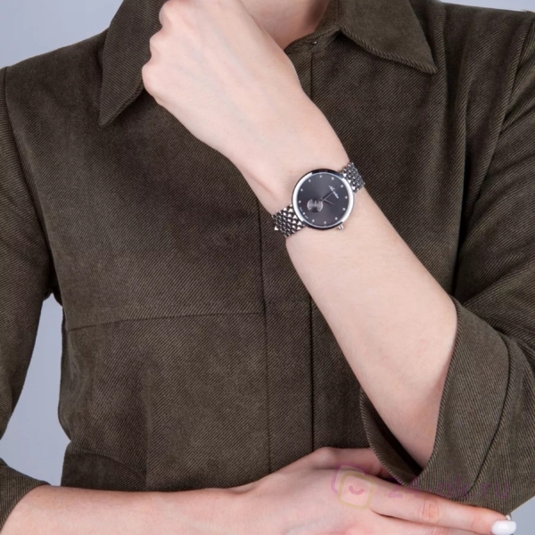 * Женские кварцевые часы в круглом корпусе на стальном браслете.