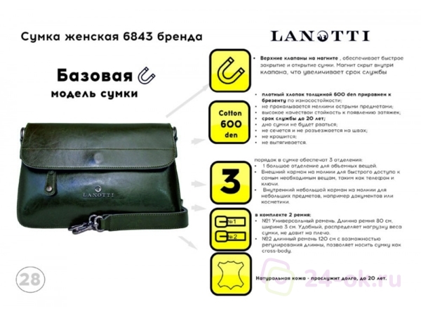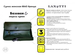 Размер: 28/10/19 Вес товара без упаковки: 0,7 Состав: натуральная кожа Вид застжеки: молния, магнитная кнопка Описание: Два ремня, короткий и длинный с возможностью регулировки. Внутри: два больших отделения с перегородкой в виде кармана на молнии, два кармана для аксессуаров, одно из которых на молнии. Снаружи: спереди карман на молнии. Сзади отделение для мелочей на молнии. Сумка выполнена из натуральной гладкой кожи с защитой double-protection, которая защитит поверхность от потертостей и царапин. Эта модель всегда будет оставаться в тренде. Такое завидное постоянство объясняется потрясающим свойством классики – не терять своей актуальности. Без труда впишется во многие образы и не потребует долгих примерок подходящей одежды. С этой сумочкой можно отправиться в гости к подруге, на прогулку, работу, в кафе, в театр или на торжественное мероприятие. Явным плюсом является ее вместительность, внутри она имеет два больших отделения с перегородкой в виде кармана на молнии.