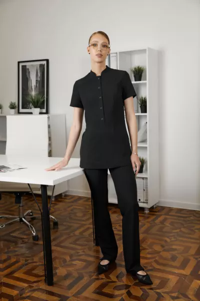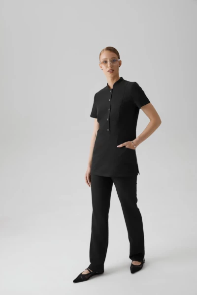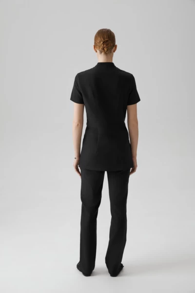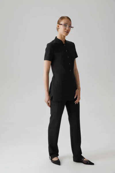 Куртка женская полуприлегающего силуэта, нераспашная с застежкой на кнопки с разрезами в боковых швах. Полочка с рельефами от плеча до отрезной части фигурной формы. Нижняя часть полочки также с рельефами от отрезной части , переходящие в боковые карманы. Полочка с притачной застежкой -планкой. Спинка с рельефами от плеча до отрезной части по спинке. Нижняя часть полочки с вытачками. Воротник втачной, стойка с закругленными концами. Рукава втачные, одношовные, короткие. Брюки женские, прямые, на притачной поясе с эластичной тесьмой ,шлёвки в поясе со шнурком с боковыми карманами.На правой штанине накладной карманы,по низу разрезы в боковых швах