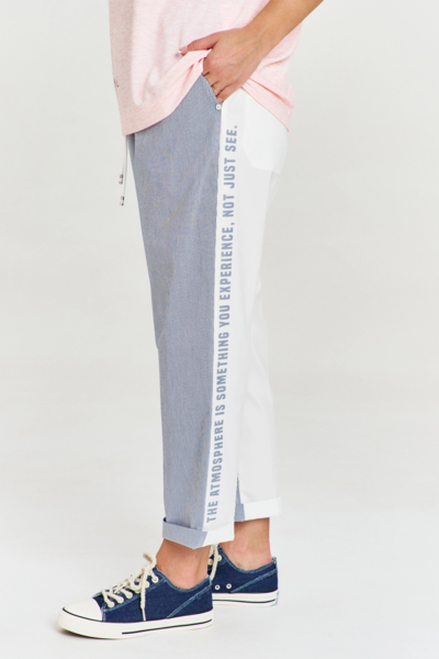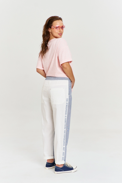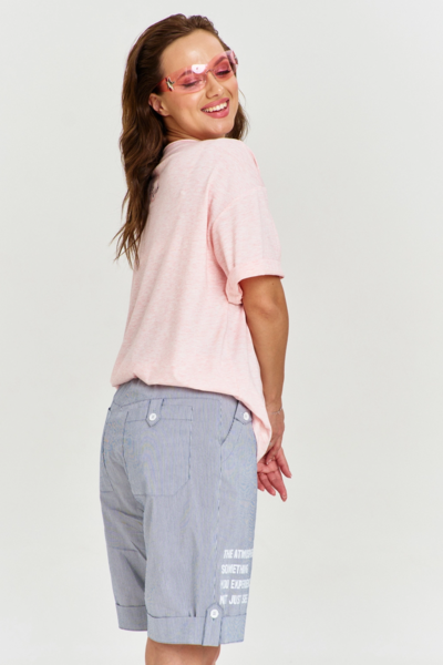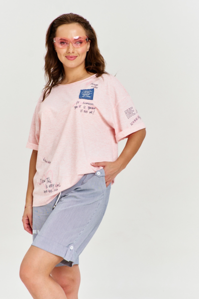 Хлопок 94% Эластан 6% Футболка из хлопковой кулирки, умеренный оверсайз, со спущенным плечом и коротким рукавом. Вырез горловины круглый, с необработанной бейкой. Изделие декорировано авторскими принтами и джинсовой нашивкой с необработанными срезами.