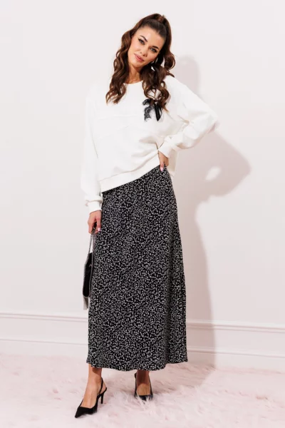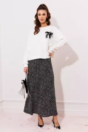 | Джемпер из технологичного трикотажного полотна с эффектом peach. С втачным рукавом на манжете. По горловине и низу изделия планки из довяза. Полочка с фигурными рельефами, имитирующими лиф. Бант из кружева сьемный. | 88% хлопок 12% ПЭ |