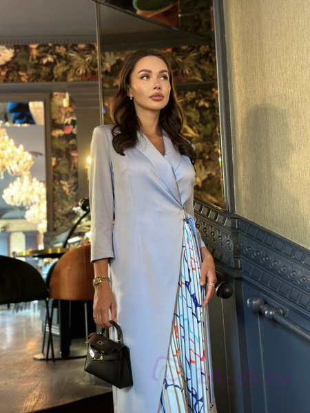 Платье женское из двух видов ткани, полуприлегающего силуэта. Перед комбинированный на запах с поясом. По переду нагрудные и талиевые вытачки. Горловина обработана воротником шалевого типа. Передняя половина юбки выполнена из ткани-компаньона с радиальным гофрированием. В боковом шве справа потайная молния. В области талии слева расположен притачной пояс из основной ткани, завязывающийся на полукольца. Спинка цельнокроеная с плечевыми и талиевыми вытачками. Рукав 7/8 втачной одношовный.. Цвет материала может отличаться по тону в зависимости от настроек вашего монитора!