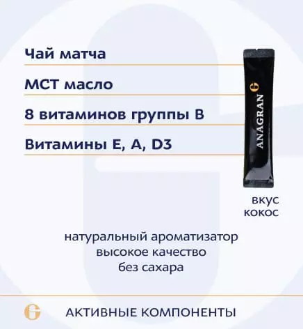 МСТ-масло порошок (средне цепочечные триглицериды), чай матча, премикс 150-23 (токоферола ацетат (витамин Е), никотинамид (витамин В3), ретинола ацетат (витамин А), пантотенат кальция (витамин В5), пиридоксина гидрохлорид (витамин В6), холекальциферол (витамин D3), тиамина мононитрат (витамин В1), рибофлавин (витамин В2), фолиевая кислота (витамин В9), биотин, цианокобаламин (витамин В12). Вспомогательные вещества: ароматизатор натуральный «Кокос», диоксид кремния (антислеживатель), ксантановая камедь (загуститель), гуаровая камедь (загуститель), сукралоза (подсластитель).