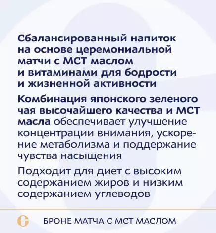 Сочетание церемониальной матчи с МСТ маслом прекрасно подходит для диет с высоким содержанием жиров и низким содержанием углеводов.